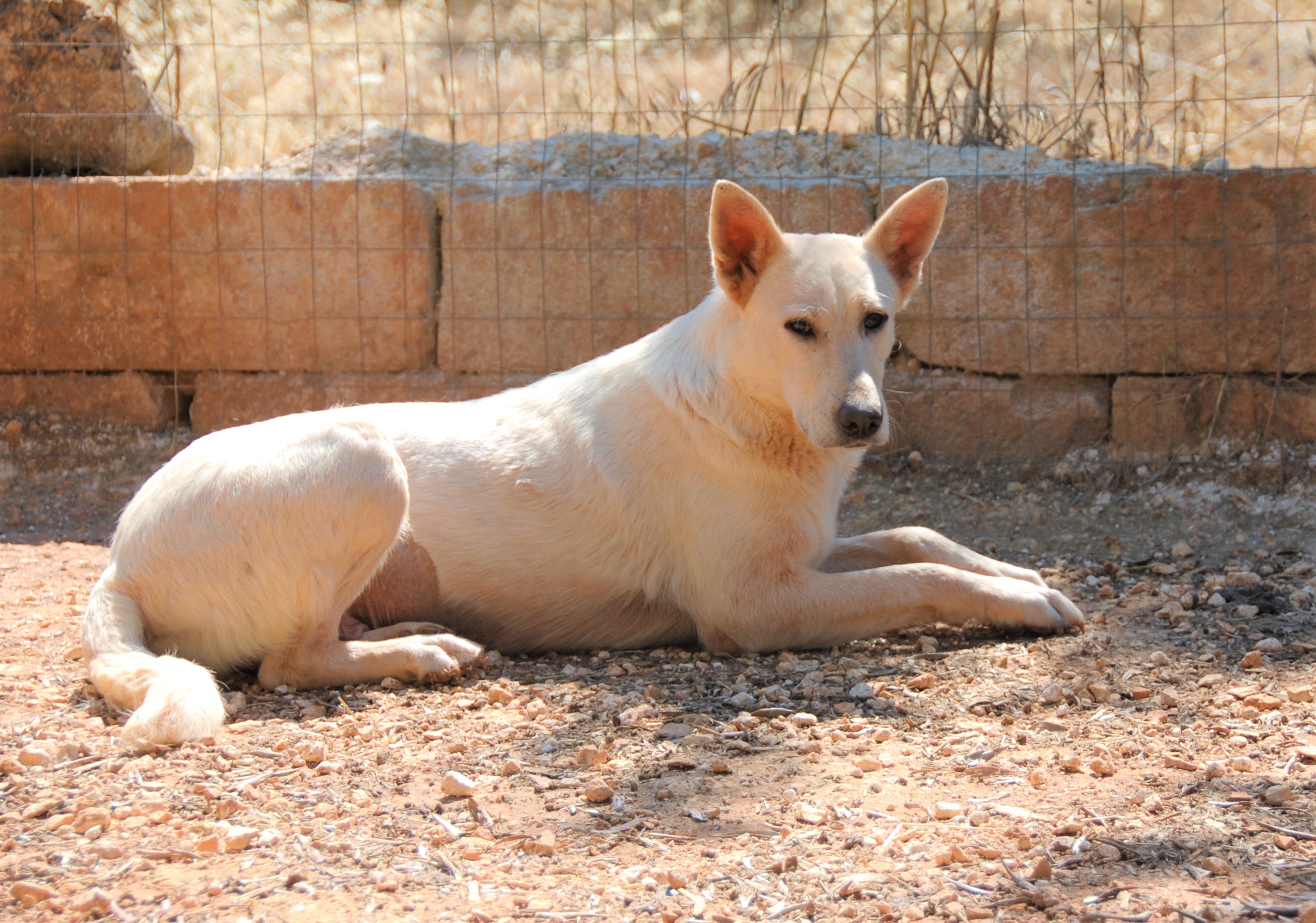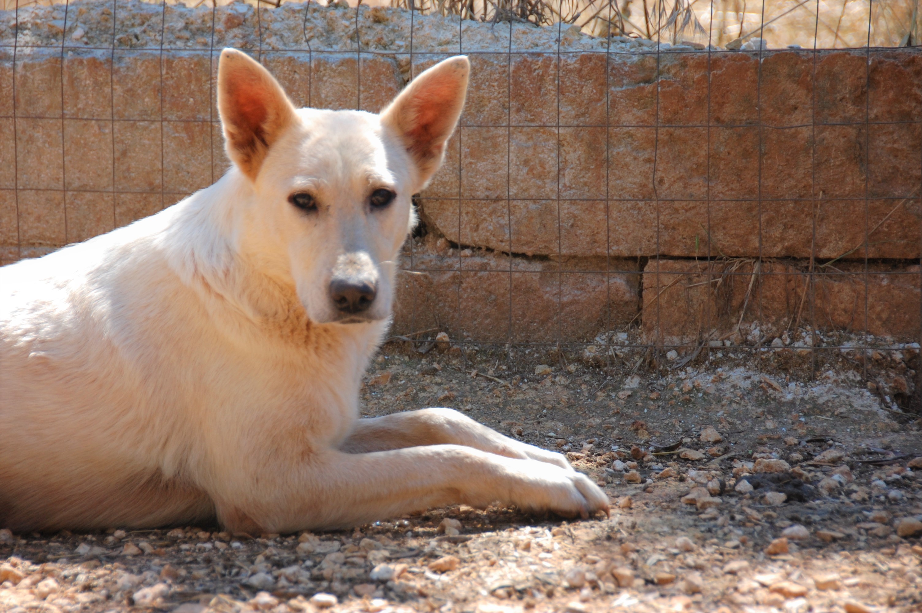 Arya hat eine besondere Aura um sich. Sie ist eine stolze Hündin, erhaben und aufrecht sitzt die helle Hündin im Gehege und beobachtet alles genau um sich herum. Doch auch Angst spiegelt sich in ihrem Blick. Die Vergangenheit hat Spuren hinterlassen und Arya vertraut den Menschen nicht mehr. Sie möchte Abstand und geht, wenn man ins Gehege zu ihr kommt. Sie ist eine ruhige Hündin und auch wenn viele Hunde um sie herum bellen, bleibt sie ruhig und bellt nicht. Leider traut sie sich nicht Leckerlies oder Streicheleinheiten anzunehmen und flieht lieber in eine Ecke des Geheges.