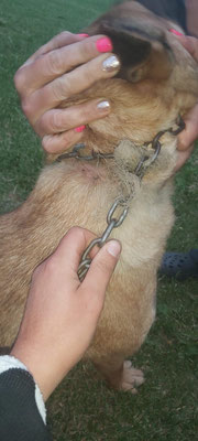 Bei seiner Familie wurde er an der Kette gehalten (siehe Foto). Die Familie wird umziehen und Iron nicht mitnehmen. Das ist zuerst mal gut. Aber jetzt ist er bei den Nachbarn in diesem Verschlag eingesperrt (siehe Fotos) was auch nicht gut ist. Eine Freiwillige des Vereins geht jeden Tag hin und versorgt ihn, hat aber nicht die Zeit, täglich mit ihm rauszugehen.