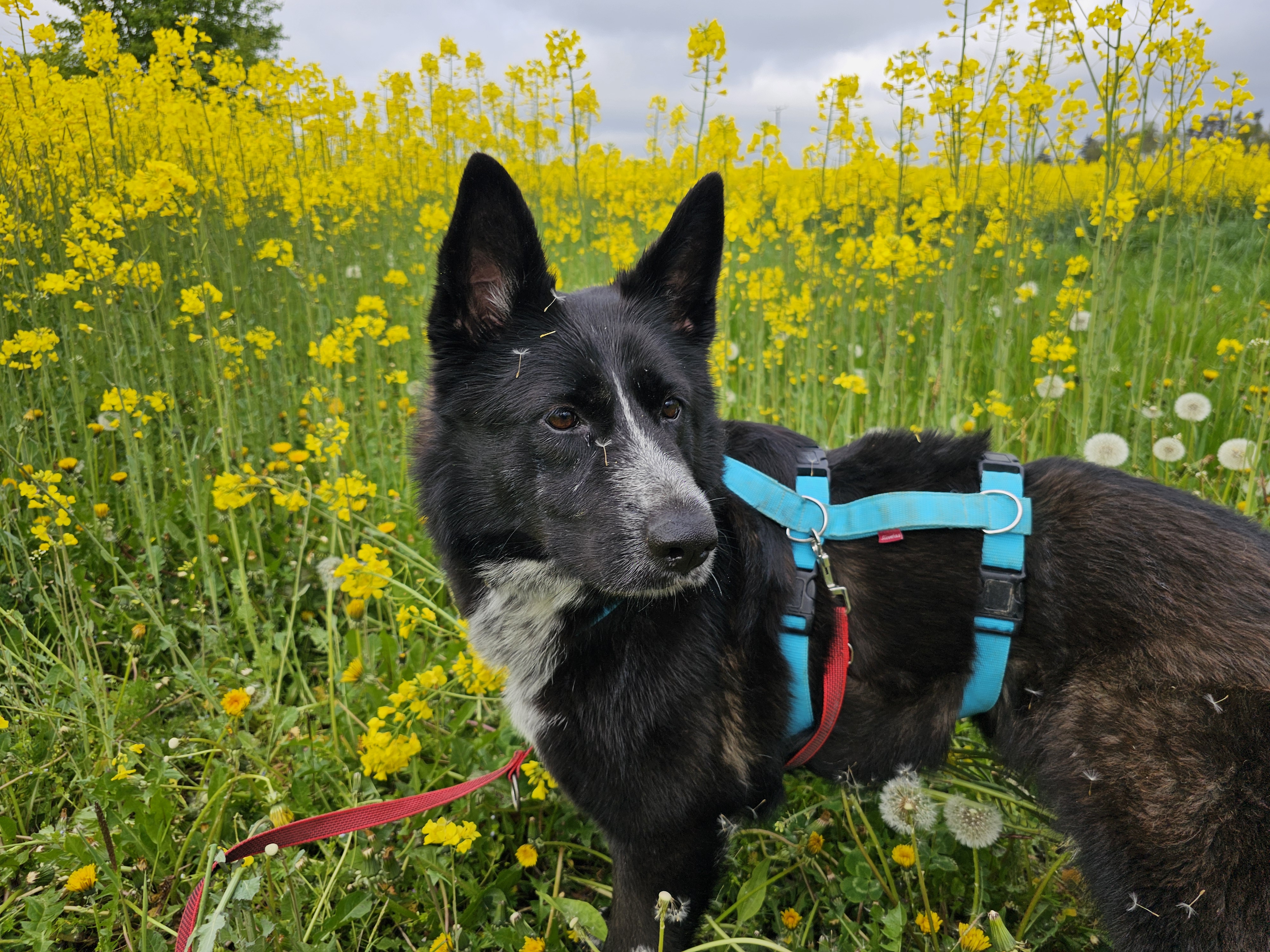 Inzwischen lebt Kelly auf einer Pflegestelle in 88273 Fronreute in einer Familie mit anderen Hunden und Katzen zusammen. Kelly ist eine ruhige, sanfte Seele – anfangs noch vorsichtig, aber wenn sie erstmal Vertrauen gefasst hat, zeigt sie, was für ein Schatz sie ist. Sie mag mittlerweile Streicheleinheiten und ist immer in der Nähe ihrer Bezugspersonen. Fellpflege, baden usw. ist kein Problem für sie. Bei fremden Menschen ist sie anfangs vorsichtig und möchte lieber Abstand. Befasst man sich aber mit ihr, taut sie nach wenigen Tagen auf und beginnt Vertrauen zu fassen. Kelly ist kein Hund, der sofort zu jedem herkommt. Gestreichelt werden möchte sie nur von vertrauten Personen, aber die Neugier treibt sie an und gerne nimmt sie auch zu Fremden Kontakt auf, am Liebsten wenn sie Leckerlies haben. Wenn Kelly unsicher ist, zeigt sich das durch Bewegungsdrang und sie läuft dann viel umher. Das hat sich aber bereits deutlich verbessert. Im Haus ist Kelly sehr vorbildlich. Sie ist stubenrein von Anfang an, lieb, bellt nicht, macht nichts kaputt und kann auch schon entspannt allein bleiben. Wenn es nach Draußen geht, steht Kelly sofort parat. Egal ob Sonne, Regen oder Wind – Kelly geht sehr gerne spazieren. Sie läuft toll an der Leine, Umweltreize wie LKWs, Fahrräder oder andere Hunde bringen sie kaum aus der Ruhe. Ein richtiges Naturtalent! Sie schnüffelt gerne, entdeckt neugierig ihre Umgebung und fährt ruhig im Auto mit. Mittlerweile steigt sie auch selbstständig auf Kommando ein. Wasser findet Kelly besonders toll und rennt gerne durch den Bach oder geht im See baden. Sie läuft ohne Leine frei sehr lieb mit und bleibt immer wieder stehen, um zu schauen, wo ihre Menschen sind. Gerne wälzt sie sich ausgiebig im Gras und hat große Freunde beim Laufen.