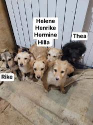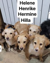 Die kleinen blonden Dackel Mix Mädchen sind schwer voneinander zu unterscheiden, HILLA hat das längste Welpenfell, HERMINE das dunkelste Gesichtchen mit der Zeichnung wie ihre Mama und auch eine schwarze Decke, und HELENE und HENRIKE wirken wie eineiige Zwillinge. THEA, die zarte Schwarze, trägt ihr Haar gerne offen und hat sich - wie unglaublich schlau - diesem kleinen Rudel in ihrem Überlebenskampf angeschlossen.